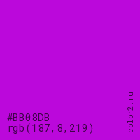 Цвет #BB08DB в цветовой модели RGB обозначается тремя октетами (187, 8, 219) в десятичном формате и #BB08DB в шестнадцатиричном (hex) формате, которые являются интенсивностью красного 187 (hex BB), интенсивность зелёного 8 (hex 08) и интенсивность синего 219 (hex DB).