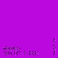 Цвет #BB09DF в цветовой модели RGB обозначается тремя октетами (187, 9, 223) в десятичном формате и #BB09DF в шестнадцатиричном (hex) формате, которые являются интенсивностью красного 187 (hex BB), интенсивность зелёного 9 (hex 09) и интенсивность синего 223 (hex DF).