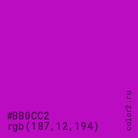 Цвет #BB0CC2 в цветовой модели RGB обозначается тремя октетами (187, 12, 194) в десятичном формате и #BB0CC2 в шестнадцатиричном (hex) формате, которые являются интенсивностью красного 187 (hex BB), интенсивность зелёного 12 (hex 0C) и интенсивность синего 194 (hex C2).