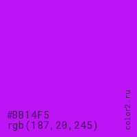 Цвет #BB14F5 в цветовой модели RGB обозначается тремя октетами (187, 20, 245) в десятичном формате и #BB14F5 в шестнадцатиричном (hex) формате, которые являются интенсивностью красного 187 (hex BB), интенсивность зелёного 20 (hex 14) и интенсивность синего 245 (hex F5).