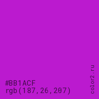 Цвет #BB1ACF в цветовой модели RGB обозначается тремя октетами (187, 26, 207) в десятичном формате и #BB1ACF в шестнадцатиричном (hex) формате, которые являются интенсивностью красного 187 (hex BB), интенсивность зелёного 26 (hex 1A) и интенсивность синего 207 (hex CF).