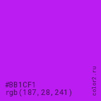 Цвет #BB1CF1 в цветовой модели RGB обозначается тремя октетами (187, 28, 241) в десятичном формате и #BB1CF1 в шестнадцатиричном (hex) формате, которые являются интенсивностью красного 187 (hex BB), интенсивность зелёного 28 (hex 1C) и интенсивность синего 241 (hex F1).