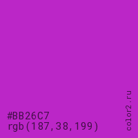 Цвет #BB26C7 в цветовой модели RGB обозначается тремя октетами (187, 38, 199) в десятичном формате и #BB26C7 в шестнадцатиричном (hex) формате, которые являются интенсивностью красного 187 (hex BB), интенсивность зелёного 38 (hex 26) и интенсивность синего 199 (hex C7).