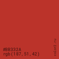Цвет #BB332A в цветовой модели RGB обозначается тремя октетами (187, 51, 42) в десятичном формате и #BB332A в шестнадцатиричном (hex) формате, которые являются интенсивностью красного 187 (hex BB), интенсивность зелёного 51 (hex 33) и интенсивность синего 42 (hex 2A).