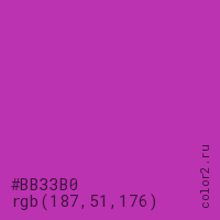 Цвет #BB33B0 в цветовой модели RGB обозначается тремя октетами (187, 51, 176) в десятичном формате и #BB33B0 в шестнадцатиричном (hex) формате, которые являются интенсивностью красного 187 (hex BB), интенсивность зелёного 51 (hex 33) и интенсивность синего 176 (hex B0).