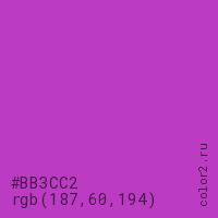 Цвет #BB3CC2 в цветовой модели RGB обозначается тремя октетами (187, 60, 194) в десятичном формате и #BB3CC2 в шестнадцатиричном (hex) формате, которые являются интенсивностью красного 187 (hex BB), интенсивность зелёного 60 (hex 3C) и интенсивность синего 194 (hex C2).