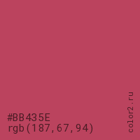 Цвет #BB435E в цветовой модели RGB обозначается тремя октетами (187, 67, 94) в десятичном формате и #BB435E в шестнадцатиричном (hex) формате, которые являются интенсивностью красного 187 (hex BB), интенсивность зелёного 67 (hex 43) и интенсивность синего 94 (hex 5E).
