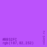 Цвет RGB(187, 82, 252) в процентом отношении количества цвета состоит из 73.3% красного (red), 32.2% зелёного (green) и 98.8% синего (blue).