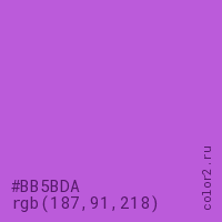 Цвет #BB5BDA в цветовой модели RGB обозначается тремя октетами (187, 91, 218) в десятичном формате и #BB5BDA в шестнадцатиричном (hex) формате, которые являются интенсивностью красного 187 (hex BB), интенсивность зелёного 91 (hex 5B) и интенсивность синего 218 (hex DA).