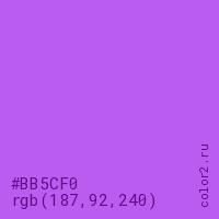 Цвет #BB5CF0 в цветовой модели RGB обозначается тремя октетами (187, 92, 240) в десятичном формате и #BB5CF0 в шестнадцатиричном (hex) формате, которые являются интенсивностью красного 187 (hex BB), интенсивность зелёного 92 (hex 5C) и интенсивность синего 240 (hex F0).