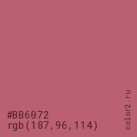 Цвет #BB6072 в цветовой модели RGB обозначается тремя октетами (187, 96, 114) в десятичном формате и #BB6072 в шестнадцатиричном (hex) формате, которые являются интенсивностью красного 187 (hex BB), интенсивность зелёного 96 (hex 60) и интенсивность синего 114 (hex 72).