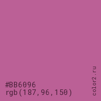 Цвет #BB6096 в цветовой модели RGB обозначается тремя октетами (187, 96, 150) в десятичном формате и #BB6096 в шестнадцатиричном (hex) формате, которые являются интенсивностью красного 187 (hex BB), интенсивность зелёного 96 (hex 60) и интенсивность синего 150 (hex 96).