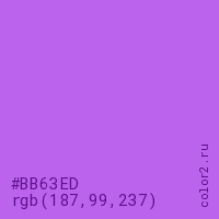Цвет #BB63ED в цветовой модели RGB обозначается тремя октетами (187, 99, 237) в десятичном формате и #BB63ED в шестнадцатиричном (hex) формате, которые являются интенсивностью красного 187 (hex BB), интенсивность зелёного 99 (hex 63) и интенсивность синего 237 (hex ED).