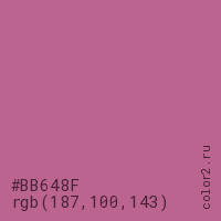 Цвет #BB648F в цветовой модели RGB обозначается тремя октетами (187, 100, 143) в десятичном формате и #BB648F в шестнадцатиричном (hex) формате, которые являются интенсивностью красного 187 (hex BB), интенсивность зелёного 100 (hex 64) и интенсивность синего 143 (hex 8F).