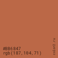 Цвет #BB6847 в цветовой модели RGB обозначается тремя октетами (187, 104, 71) в десятичном формате и #BB6847 в шестнадцатиричном (hex) формате, которые являются интенсивностью красного 187 (hex BB), интенсивность зелёного 104 (hex 68) и интенсивность синего 71 (hex 47).