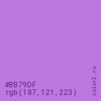 Цвет #BB79DF в цветовой модели RGB обозначается тремя октетами (187, 121, 223) в десятичном формате и #BB79DF в шестнадцатиричном (hex) формате, которые являются интенсивностью красного 187 (hex BB), интенсивность зелёного 121 (hex 79) и интенсивность синего 223 (hex DF).