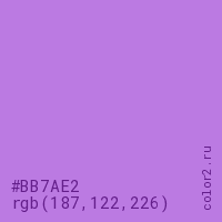 Цвет #BB7AE2 в цветовой модели RGB обозначается тремя октетами (187, 122, 226) в десятичном формате и #BB7AE2 в шестнадцатиричном (hex) формате, которые являются интенсивностью красного 187 (hex BB), интенсивность зелёного 122 (hex 7A) и интенсивность синего 226 (hex E2).