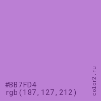 Цвет #BB7FD4 в цветовой модели RGB обозначается тремя октетами (187, 127, 212) в десятичном формате и #BB7FD4 в шестнадцатиричном (hex) формате, которые являются интенсивностью красного 187 (hex BB), интенсивность зелёного 127 (hex 7F) и интенсивность синего 212 (hex D4).