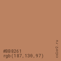 Цвет #BB8261 в цветовой модели RGB обозначается тремя октетами (187, 130, 97) в десятичном формате и #BB8261 в шестнадцатиричном (hex) формате, которые являются интенсивностью красного 187 (hex BB), интенсивность зелёного 130 (hex 82) и интенсивность синего 97 (hex 61).