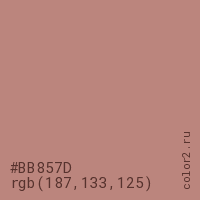 Цвет #BB857D в цветовой модели RGB обозначается тремя октетами (187, 133, 125) в десятичном формате и #BB857D в шестнадцатиричном (hex) формате, которые являются интенсивностью красного 187 (hex BB), интенсивность зелёного 133 (hex 85) и интенсивность синего 125 (hex 7D).