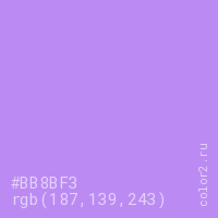 Цвет #BB8BF3 в цветовой модели RGB обозначается тремя октетами (187, 139, 243) в десятичном формате и #BB8BF3 в шестнадцатиричном (hex) формате, которые являются интенсивностью красного 187 (hex BB), интенсивность зелёного 139 (hex 8B) и интенсивность синего 243 (hex F3).