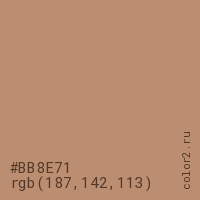 Цвет #BB8E71 в цветовой модели RGB обозначается тремя октетами (187, 142, 113) в десятичном формате и #BB8E71 в шестнадцатиричном (hex) формате, которые являются интенсивностью красного 187 (hex BB), интенсивность зелёного 142 (hex 8E) и интенсивность синего 113 (hex 71).