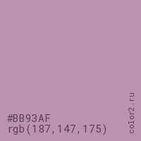 Цвет #BB93AF в цветовой модели RGB обозначается тремя октетами (187, 147, 175) в десятичном формате и #BB93AF в шестнадцатиричном (hex) формате, которые являются интенсивностью красного 187 (hex BB), интенсивность зелёного 147 (hex 93) и интенсивность синего 175 (hex AF).
