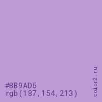 Цвет #BB9AD5 в цветовой модели RGB обозначается тремя октетами (187, 154, 213) в десятичном формате и #BB9AD5 в шестнадцатиричном (hex) формате, которые являются интенсивностью красного 187 (hex BB), интенсивность зелёного 154 (hex 9A) и интенсивность синего 213 (hex D5).