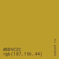 Цвет #BB9C2C в цветовой модели RGB обозначается тремя октетами (187, 156, 44) в десятичном формате и #BB9C2C в шестнадцатиричном (hex) формате, которые являются интенсивностью красного 187 (hex BB), интенсивность зелёного 156 (hex 9C) и интенсивность синего 44 (hex 2C).