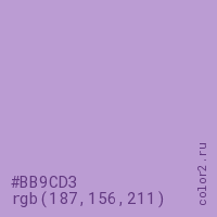 Цвет #BB9CD3 в цветовой модели RGB обозначается тремя октетами (187, 156, 211) в десятичном формате и #BB9CD3 в шестнадцатиричном (hex) формате, которые являются интенсивностью красного 187 (hex BB), интенсивность зелёного 156 (hex 9C) и интенсивность синего 211 (hex D3).