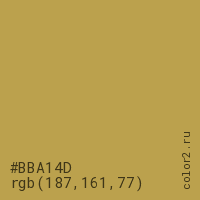 Цвет #BBA14D в цветовой модели RGB обозначается тремя октетами (187, 161, 77) в десятичном формате и #BBA14D в шестнадцатиричном (hex) формате, которые являются интенсивностью красного 187 (hex BB), интенсивность зелёного 161 (hex A1) и интенсивность синего 77 (hex 4D).