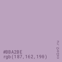 Цвет #BBA2BE в цветовой модели RGB обозначается тремя октетами (187, 162, 190) в десятичном формате и #BBA2BE в шестнадцатиричном (hex) формате, которые являются интенсивностью красного 187 (hex BB), интенсивность зелёного 162 (hex A2) и интенсивность синего 190 (hex BE).