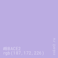 Цвет #BBACE2 в цветовой модели RGB обозначается тремя октетами (187, 172, 226) в десятичном формате и #BBACE2 в шестнадцатиричном (hex) формате, которые являются интенсивностью красного 187 (hex BB), интенсивность зелёного 172 (hex AC) и интенсивность синего 226 (hex E2).