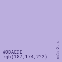 Цвет #BBAEDE в цветовой модели RGB обозначается тремя октетами (187, 174, 222) в десятичном формате и #BBAEDE в шестнадцатиричном (hex) формате, которые являются интенсивностью красного 187 (hex BB), интенсивность зелёного 174 (hex AE) и интенсивность синего 222 (hex DE).