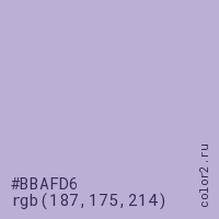 Цвет #BBAFD6 в цветовой модели RGB обозначается тремя октетами (187, 175, 214) в десятичном формате и #BBAFD6 в шестнадцатиричном (hex) формате, которые являются интенсивностью красного 187 (hex BB), интенсивность зелёного 175 (hex AF) и интенсивность синего 214 (hex D6).