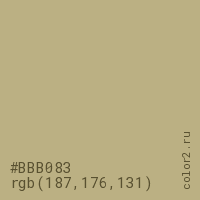Цвет #BBB083 в цветовой модели RGB обозначается тремя октетами (187, 176, 131) в десятичном формате и #BBB083 в шестнадцатиричном (hex) формате, которые являются интенсивностью красного 187 (hex BB), интенсивность зелёного 176 (hex B0) и интенсивность синего 131 (hex 83).
