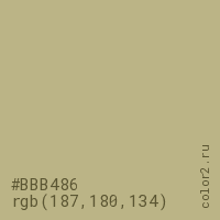 Цвет #BBB486 в цветовой модели RGB обозначается тремя октетами (187, 180, 134) в десятичном формате и #BBB486 в шестнадцатиричном (hex) формате, которые являются интенсивностью красного 187 (hex BB), интенсивность зелёного 180 (hex B4) и интенсивность синего 134 (hex 86).