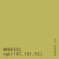 Цвет #BBB55C в цветовой модели RGB обозначается тремя октетами (187, 181, 92) в десятичном формате и #BBB55C в шестнадцатиричном (hex) формате, которые являются интенсивностью красного 187 (hex BB), интенсивность зелёного 181 (hex B5) и интенсивность синего 92 (hex 5C).