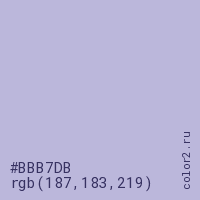 Цвет #BBB7DB в цветовой модели RGB обозначается тремя октетами (187, 183, 219) в десятичном формате и #BBB7DB в шестнадцатиричном (hex) формате, которые являются интенсивностью красного 187 (hex BB), интенсивность зелёного 183 (hex B7) и интенсивность синего 219 (hex DB).
