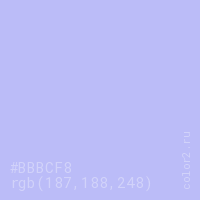 Цвет #BBBCF8 в цветовой модели RGB обозначается тремя октетами (187, 188, 248) в десятичном формате и #BBBCF8 в шестнадцатиричном (hex) формате, которые являются интенсивностью красного 187 (hex BB), интенсивность зелёного 188 (hex BC) и интенсивность синего 248 (hex F8).