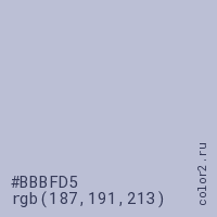 Цвет #BBBFD5 в цветовой модели RGB обозначается тремя октетами (187, 191, 213) в десятичном формате и #BBBFD5 в шестнадцатиричном (hex) формате, которые являются интенсивностью красного 187 (hex BB), интенсивность зелёного 191 (hex BF) и интенсивность синего 213 (hex D5).