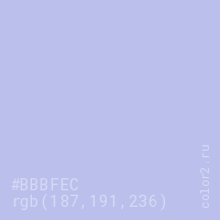 Цвет #BBBFEC в цветовой модели RGB обозначается тремя октетами (187, 191, 236) в десятичном формате и #BBBFEC в шестнадцатиричном (hex) формате, которые являются интенсивностью красного 187 (hex BB), интенсивность зелёного 191 (hex BF) и интенсивность синего 236 (hex EC).