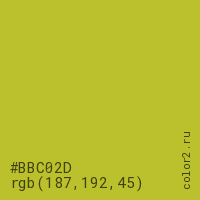 Цвет #BBC02D в цветовой модели RGB обозначается тремя октетами (187, 192, 45) в десятичном формате и #BBC02D в шестнадцатиричном (hex) формате, которые являются интенсивностью красного 187 (hex BB), интенсивность зелёного 192 (hex C0) и интенсивность синего 45 (hex 2D).