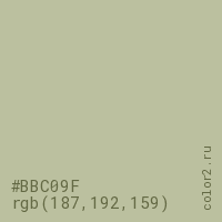 Цвет #BBC09F в цветовой модели RGB обозначается тремя октетами (187, 192, 159) в десятичном формате и #BBC09F в шестнадцатиричном (hex) формате, которые являются интенсивностью красного 187 (hex BB), интенсивность зелёного 192 (hex C0) и интенсивность синего 159 (hex 9F).