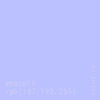 Цвет #BBC0FF в цветовой модели RGB обозначается тремя октетами (187, 192, 255) в десятичном формате и #BBC0FF в шестнадцатиричном (hex) формате, которые являются интенсивностью красного 187 (hex BB), интенсивность зелёного 192 (hex C0) и интенсивность синего 255 (hex FF).