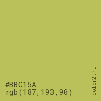 Цвет #BBC15A в цветовой модели RGB обозначается тремя октетами (187, 193, 90) в десятичном формате и #BBC15A в шестнадцатиричном (hex) формате, которые являются интенсивностью красного 187 (hex BB), интенсивность зелёного 193 (hex C1) и интенсивность синего 90 (hex 5A).