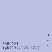 Цвет #BBC1E1 в цветовой модели RGB обозначается тремя октетами (187, 193, 225) в десятичном формате и #BBC1E1 в шестнадцатиричном (hex) формате, которые являются интенсивностью красного 187 (hex BB), интенсивность зелёного 193 (hex C1) и интенсивность синего 225 (hex E1).