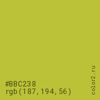 Цвет #BBC238 в цветовой модели RGB обозначается тремя октетами (187, 194, 56) в десятичном формате и #BBC238 в шестнадцатиричном (hex) формате, которые являются интенсивностью красного 187 (hex BB), интенсивность зелёного 194 (hex C2) и интенсивность синего 56 (hex 38).