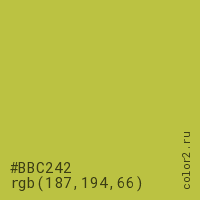 Цвет #BBC242 в цветовой модели RGB обозначается тремя октетами (187, 194, 66) в десятичном формате и #BBC242 в шестнадцатиричном (hex) формате, которые являются интенсивностью красного 187 (hex BB), интенсивность зелёного 194 (hex C2) и интенсивность синего 66 (hex 42).