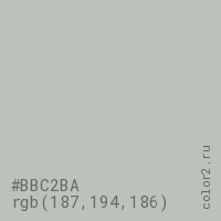 Цвет #BBC2BA в цветовой модели RGB обозначается тремя октетами (187, 194, 186) в десятичном формате и #BBC2BA в шестнадцатиричном (hex) формате, которые являются интенсивностью красного 187 (hex BB), интенсивность зелёного 194 (hex C2) и интенсивность синего 186 (hex BA).